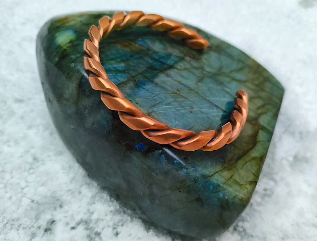This bracelet is made of copper, ensuring durability, antiseptic properties, and comfortable wearing.